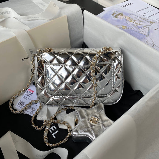 CC MINI 19 FLAP BAG IN SILVER METALLIC CALFSKIN WITH STRAP