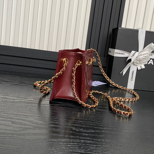 HANDBAG 21 IN GARNET RED DIAMOND PATTERN QUILTED SHINY LAMBSKIN GOLD HARDWARE