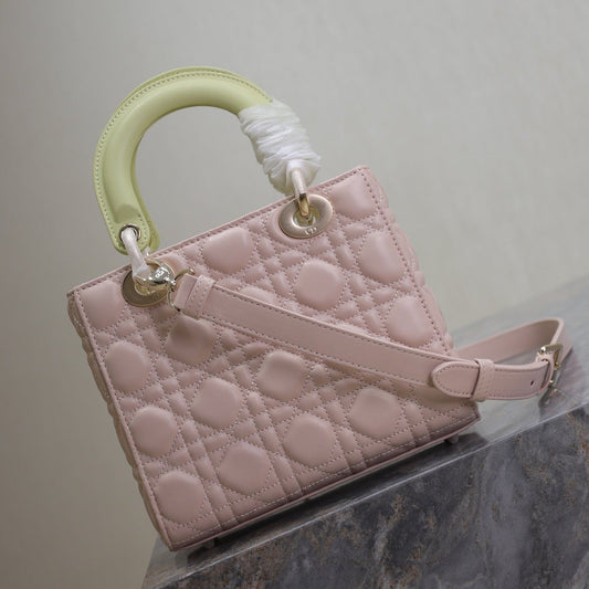 MINI LADY BAG 17 IN BABY PINK QUILTED MACROCANNAGE CALFSKIN SWAMP YELLOW STRAP