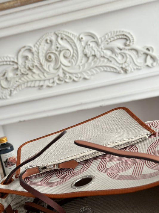 HERBAG ZIP 31 RETOURNE PEGASE POP BAG IN OFF-WHITE MIX RED CANVAS AND HUNTER COWHIDE