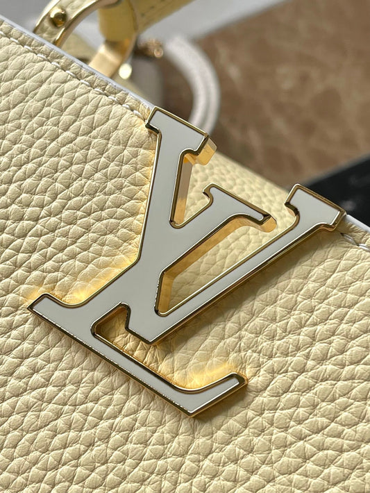 CAPUCINES SOUPLE GM 38 IN WHITE CANVAS AND TAUPE CALFSKIN TRIM