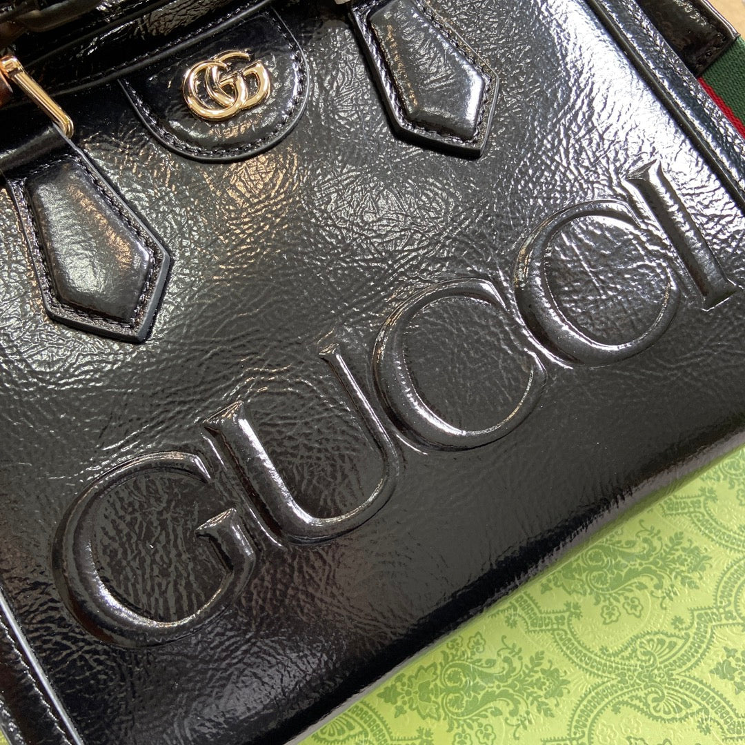 DIANA SMALL TOTE BAG 27 WITH WEB IN BLACK LACQUER CALFSKIN BAMBOO HANDLE