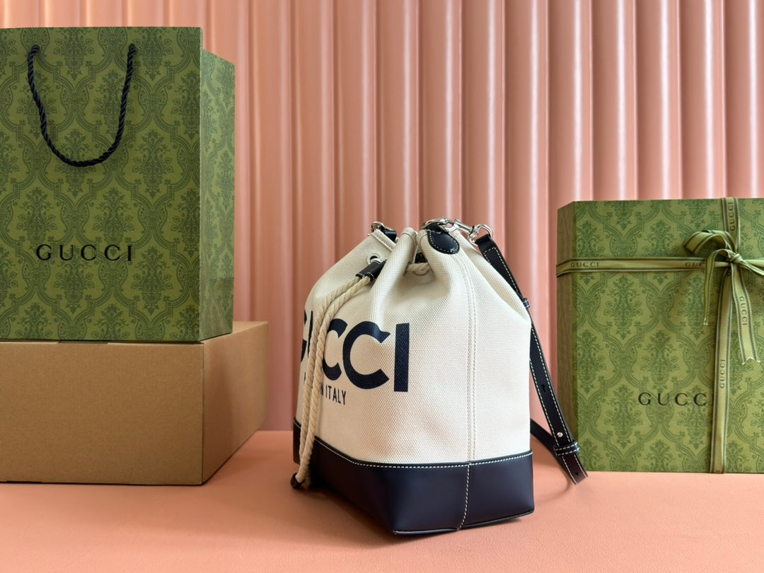 DRAWSTRING SHOULDER BAG LOGO PRINT 31 IN WHITE CANVAS DARK BLUE CALFSKIN