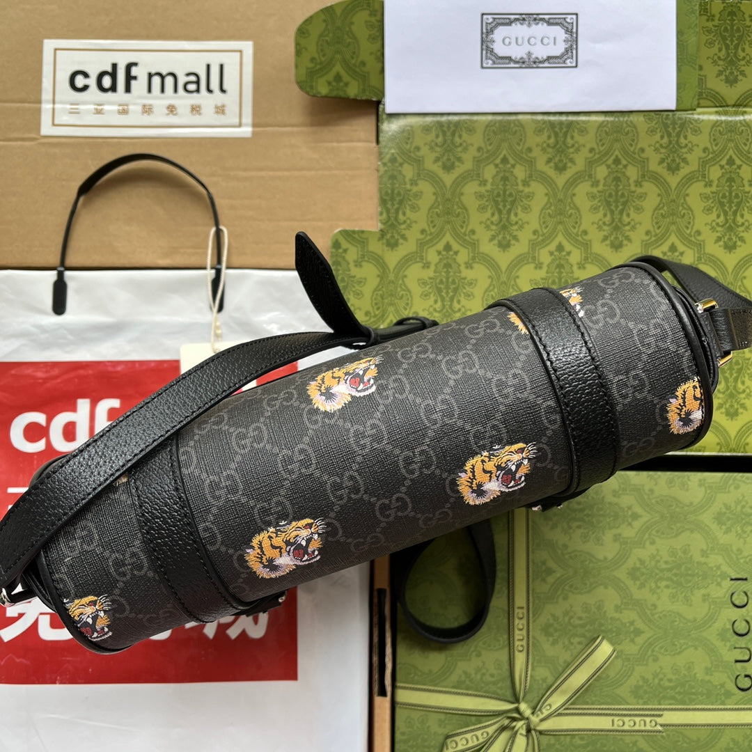 TIGER PRINT MESSENGER BAG 28 IN BLACK CANVAS AND LEATHER TRIM