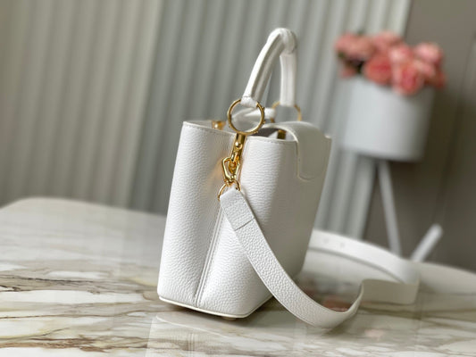 CAPUCINES EAST-WEST MINI 21 IN WHITE TAURILLON LEATHER GOLD-TONE HARDWARE