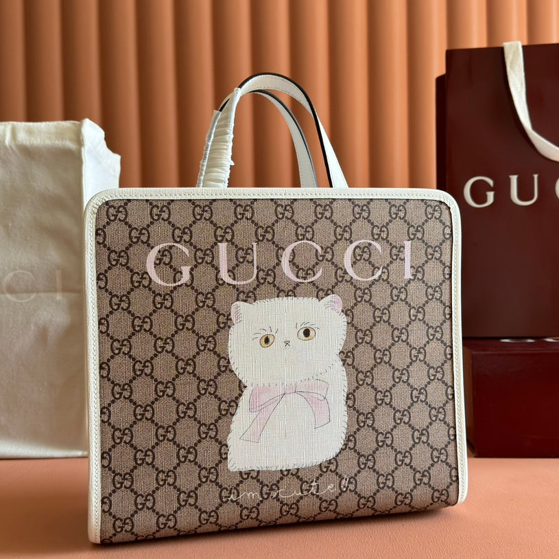 CHILDREN'S PRINTED BIG CAT TOTE BAG 28.5 IN BEIGE AND DARK BROWN GG CANVAS WHITE TRIM