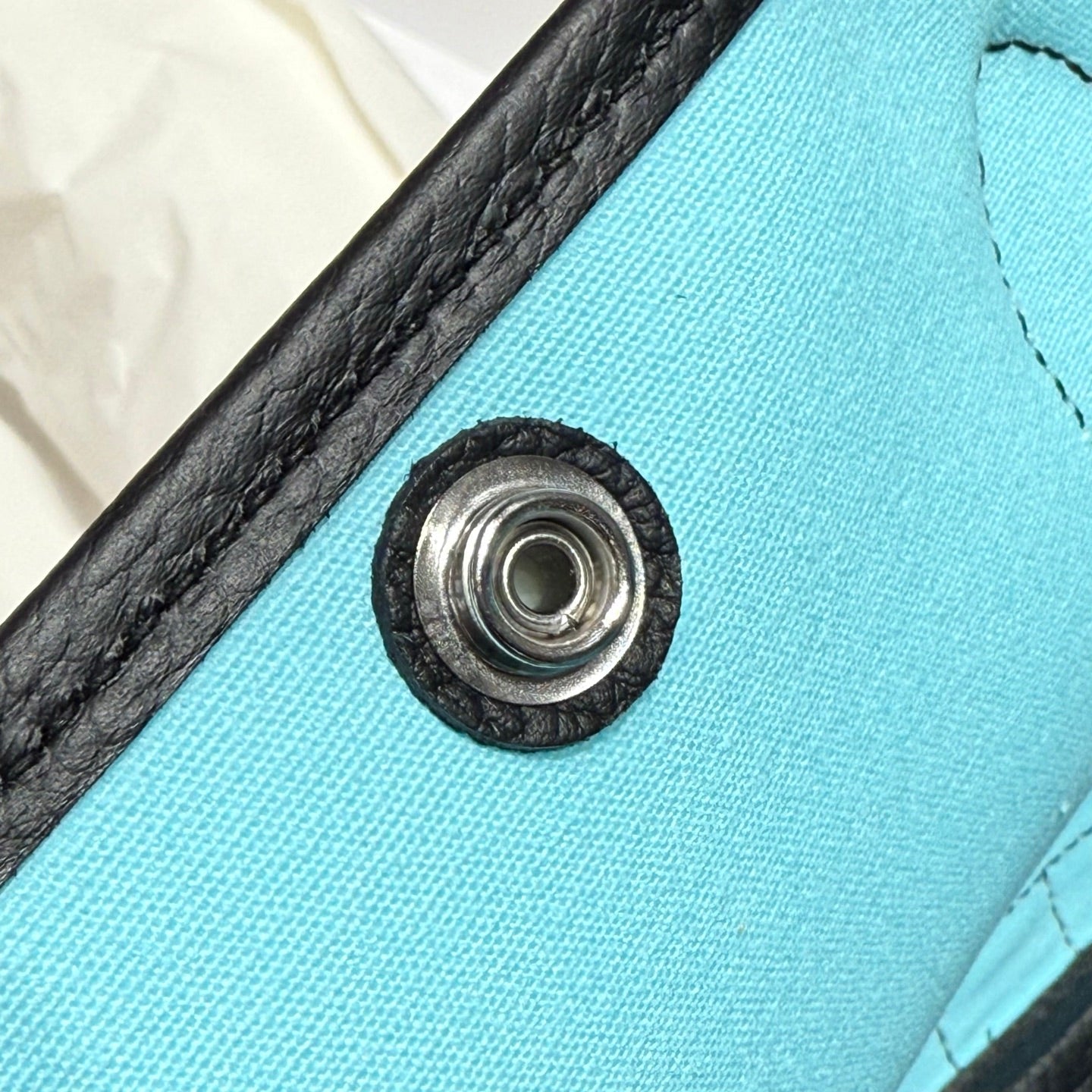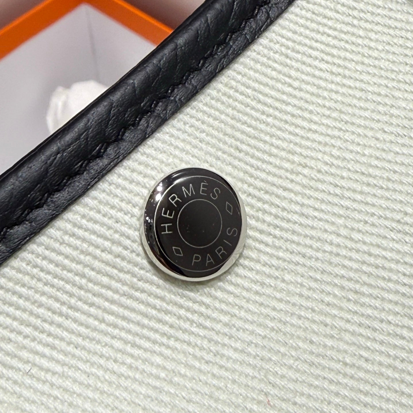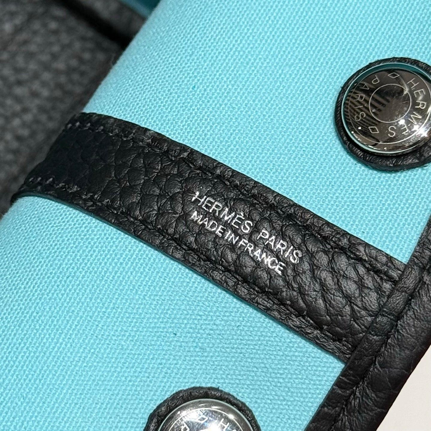 GARDEN PARTY 30CM IN WHITE TOILETS COTTON CANVAS AND BLACK CALFSKIN SKY BLUE CANVAS ON SIDE OTHER