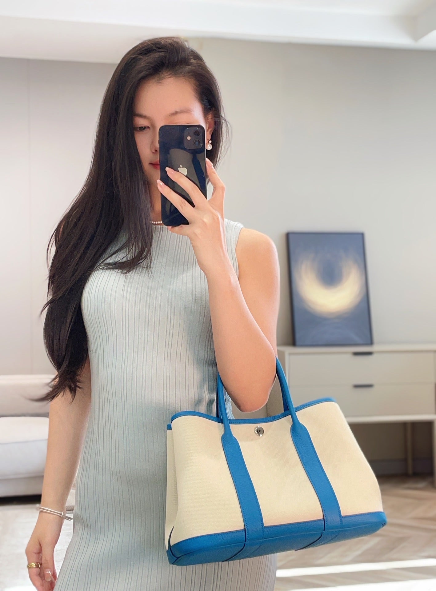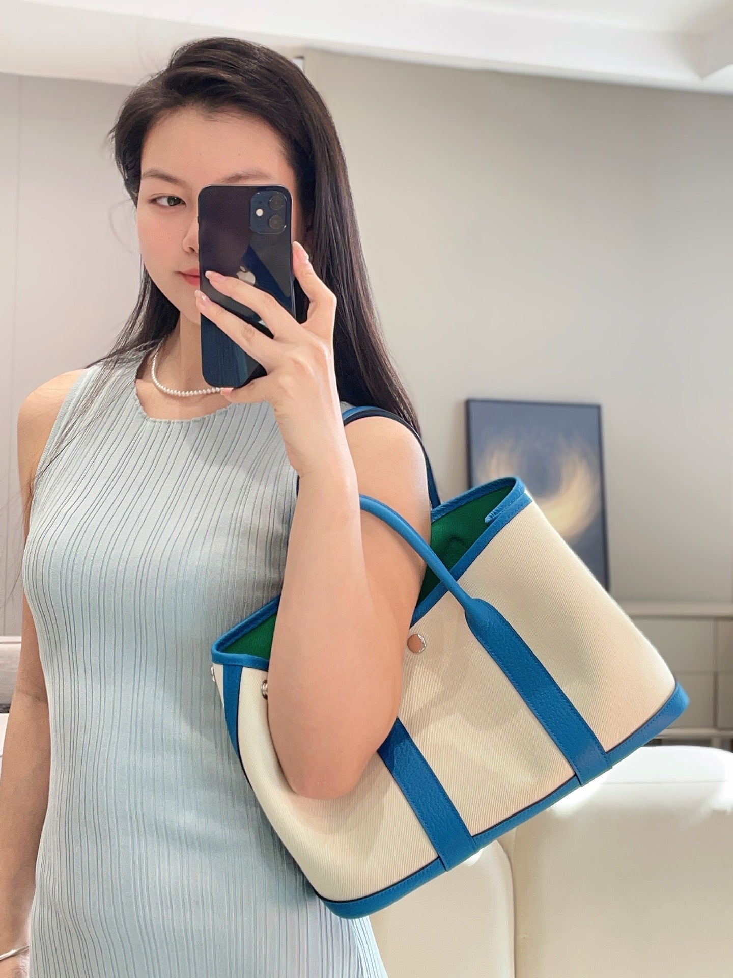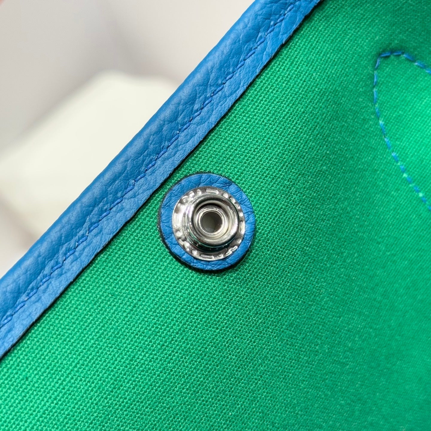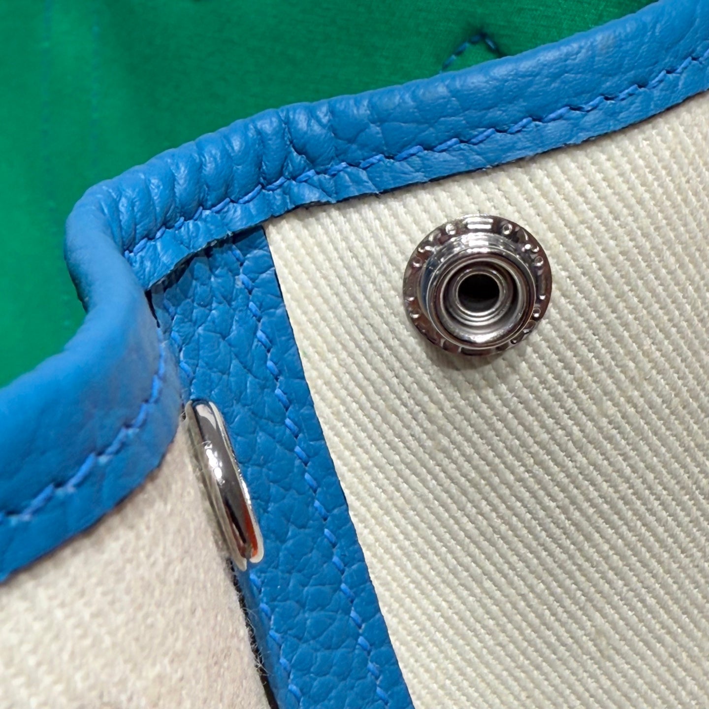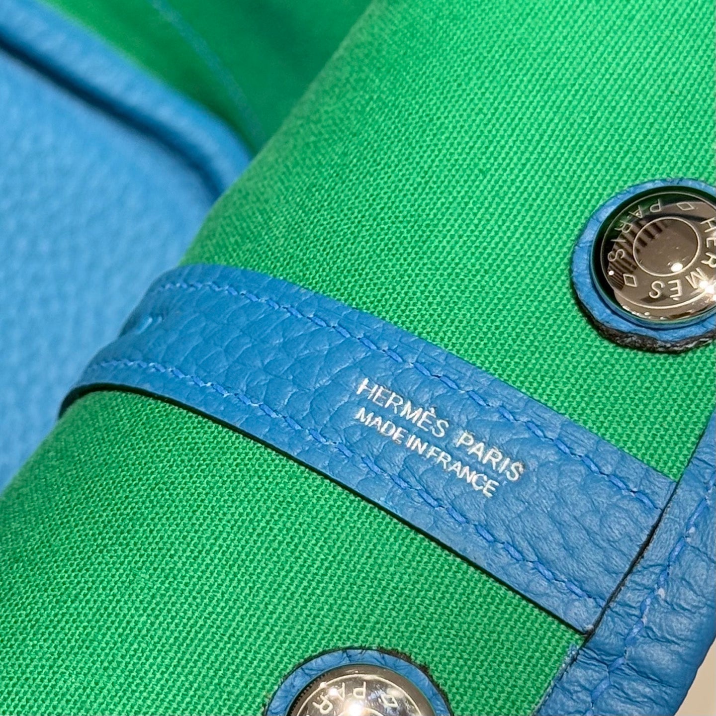 GARDEN PARTY 30CM IN WHITE TOILETS COTTON CANVAS AND BLUE CALFSKIN GREEN ON SIDE OTHER