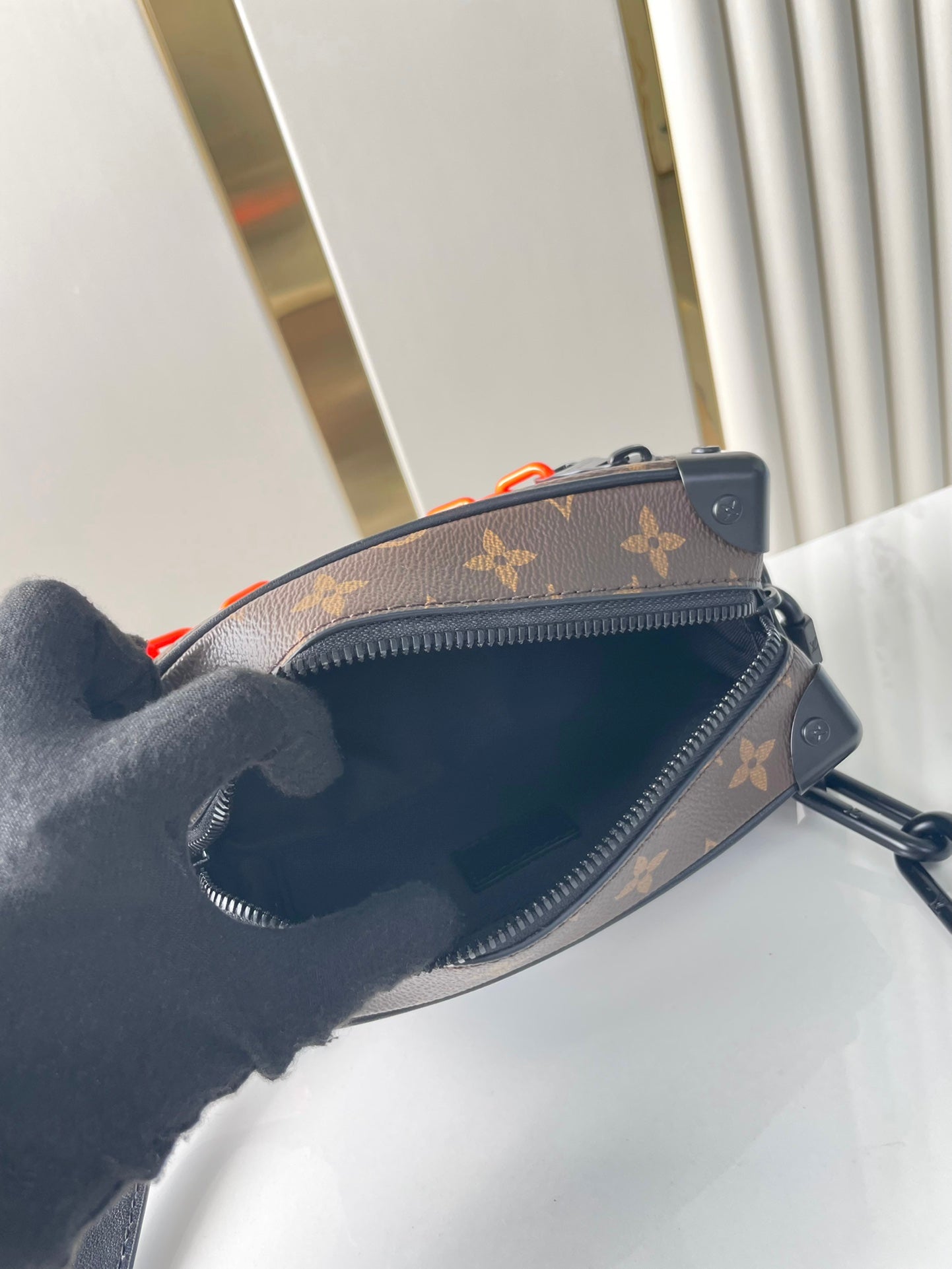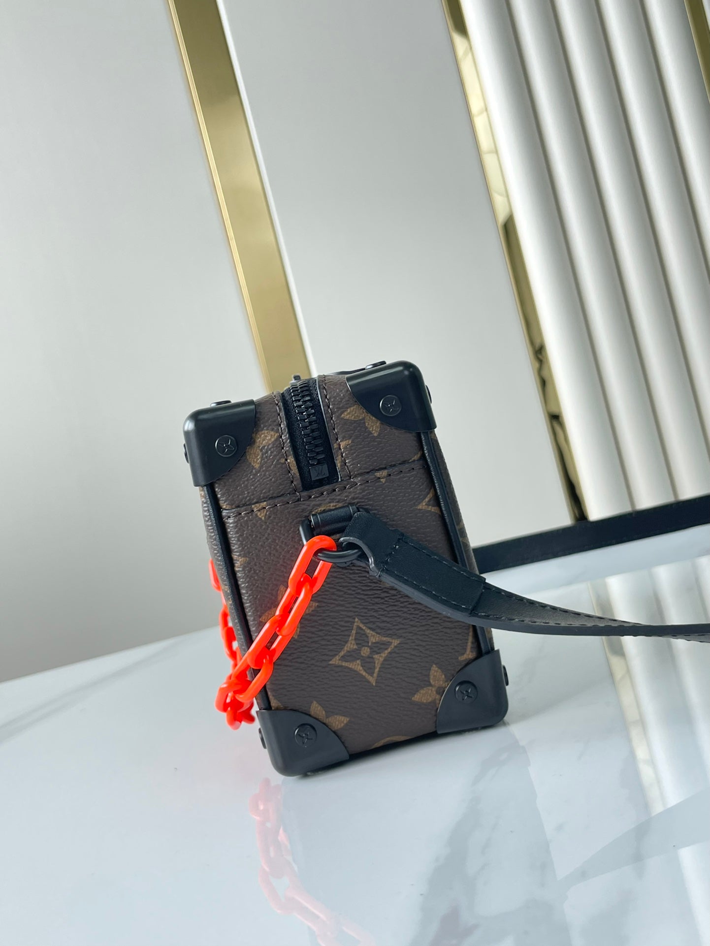MINI SOFT TRUNK 18 IN BROWN MONOGRAM CANVAS RED ORANGE CHAIN