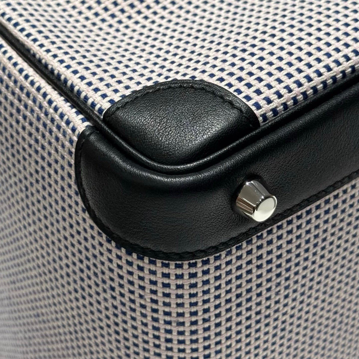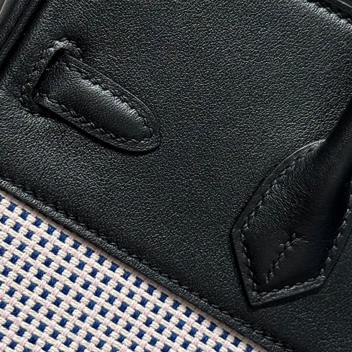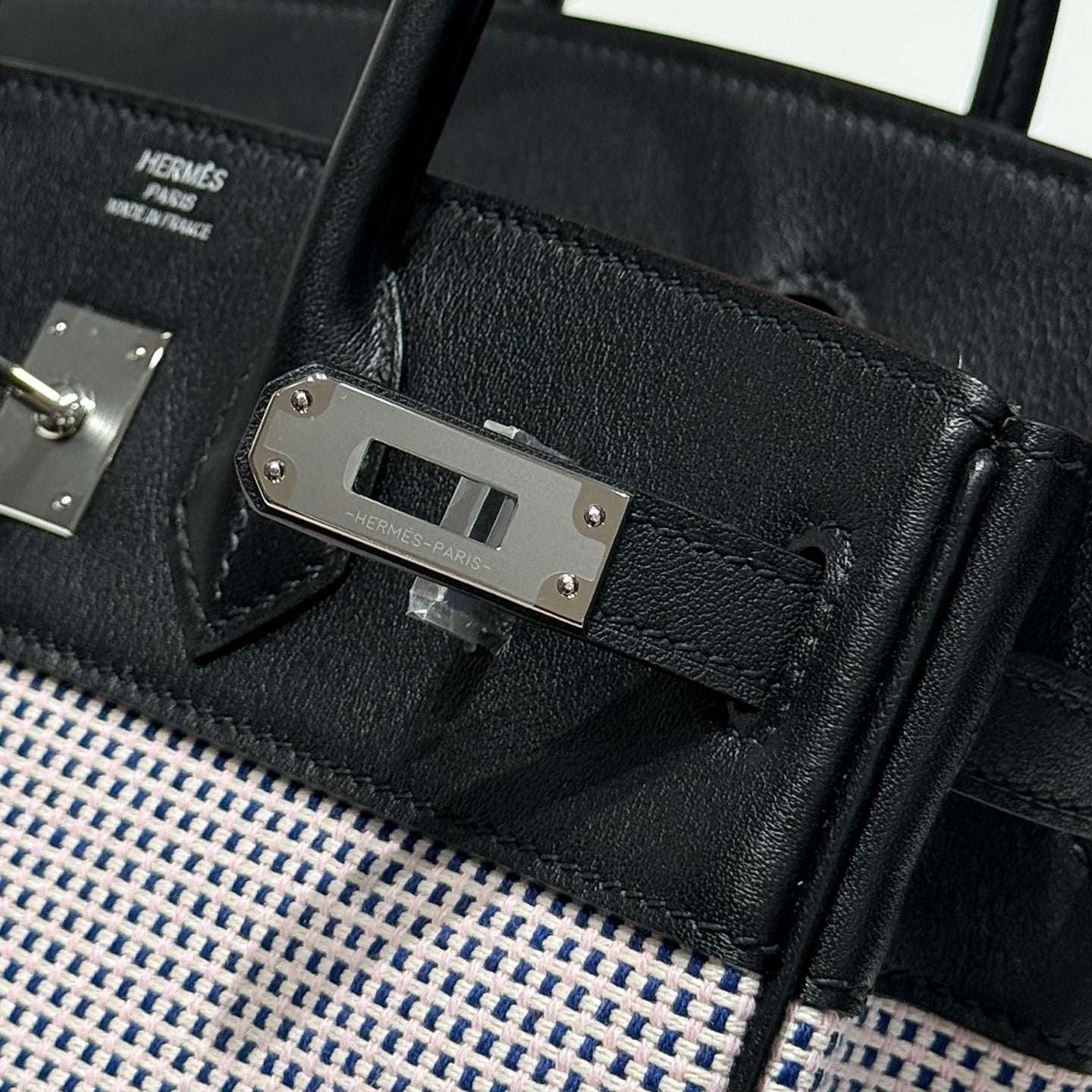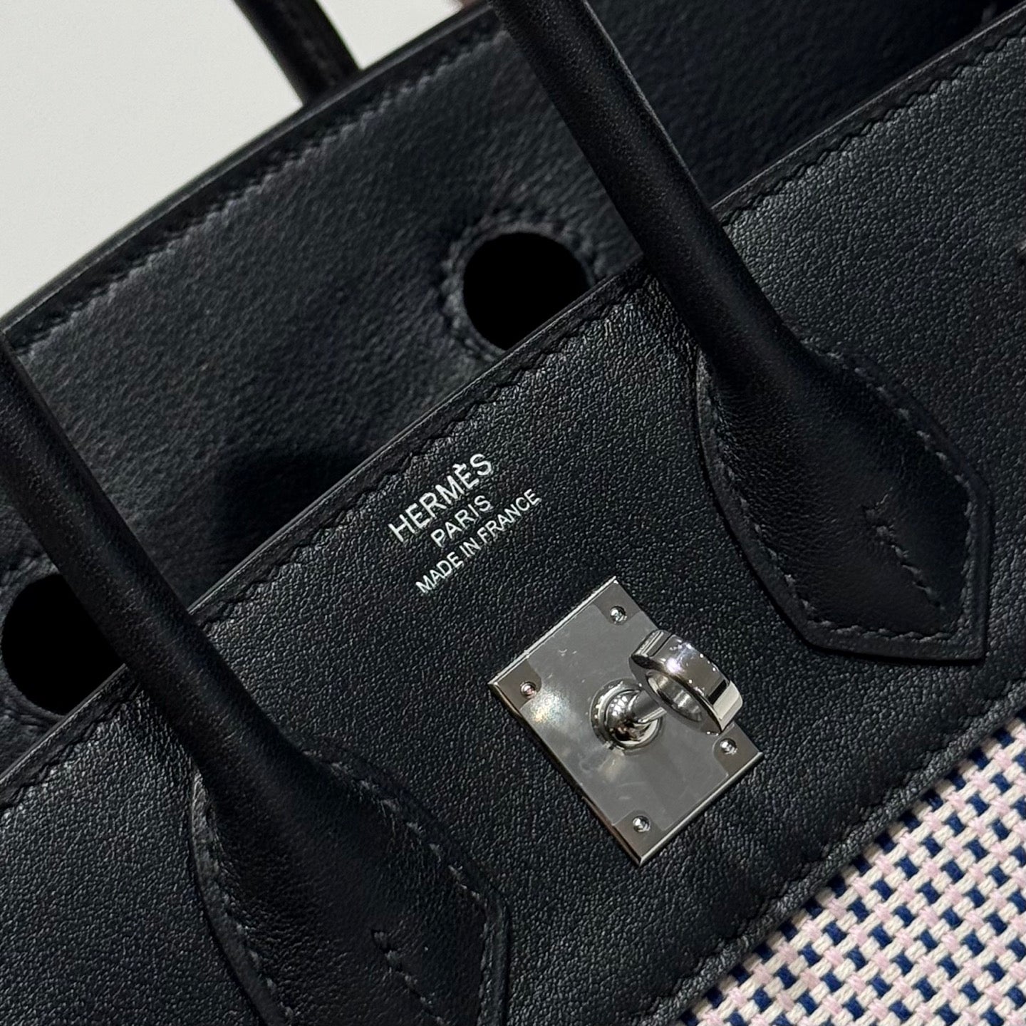 QUADRILLE BIRKIN 25CM IN BLACK SWIFT CALFSKIN WHITE BLUE PINK PLAID TOILE CANVAS