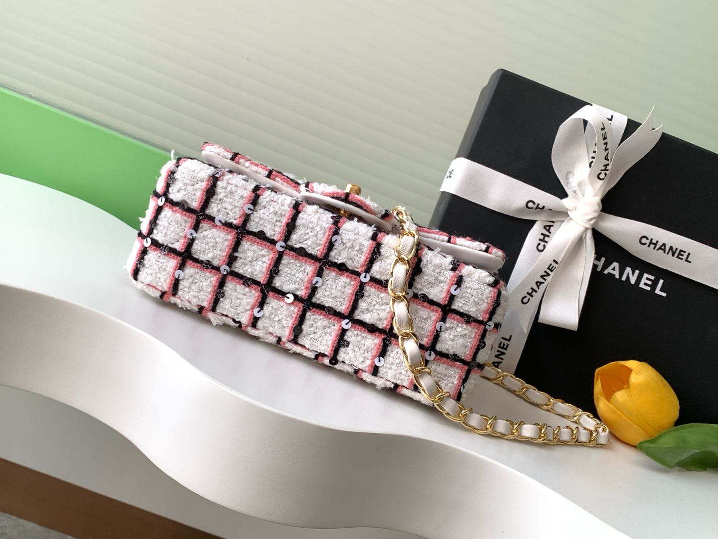 WOOL TWEED FLAP BAG 20 WHITE BLACK PINK ATTACHED SEQUINS 238423